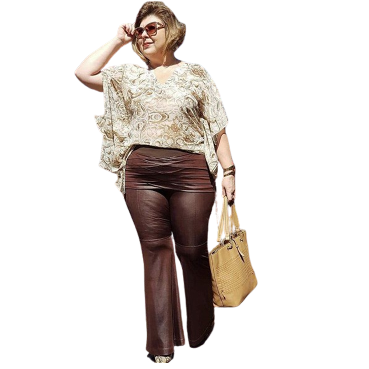 Diferencial de modelagem: Seu tecido que imita o couro, é extremamente confortável pois possui elastano, sua modelagem flare, favorece o biotipo plus, possui também um detalhe em camadas na frente, na altura da barriga, que alem de disfarçar a barriguinha, da um charme á mais na peça.