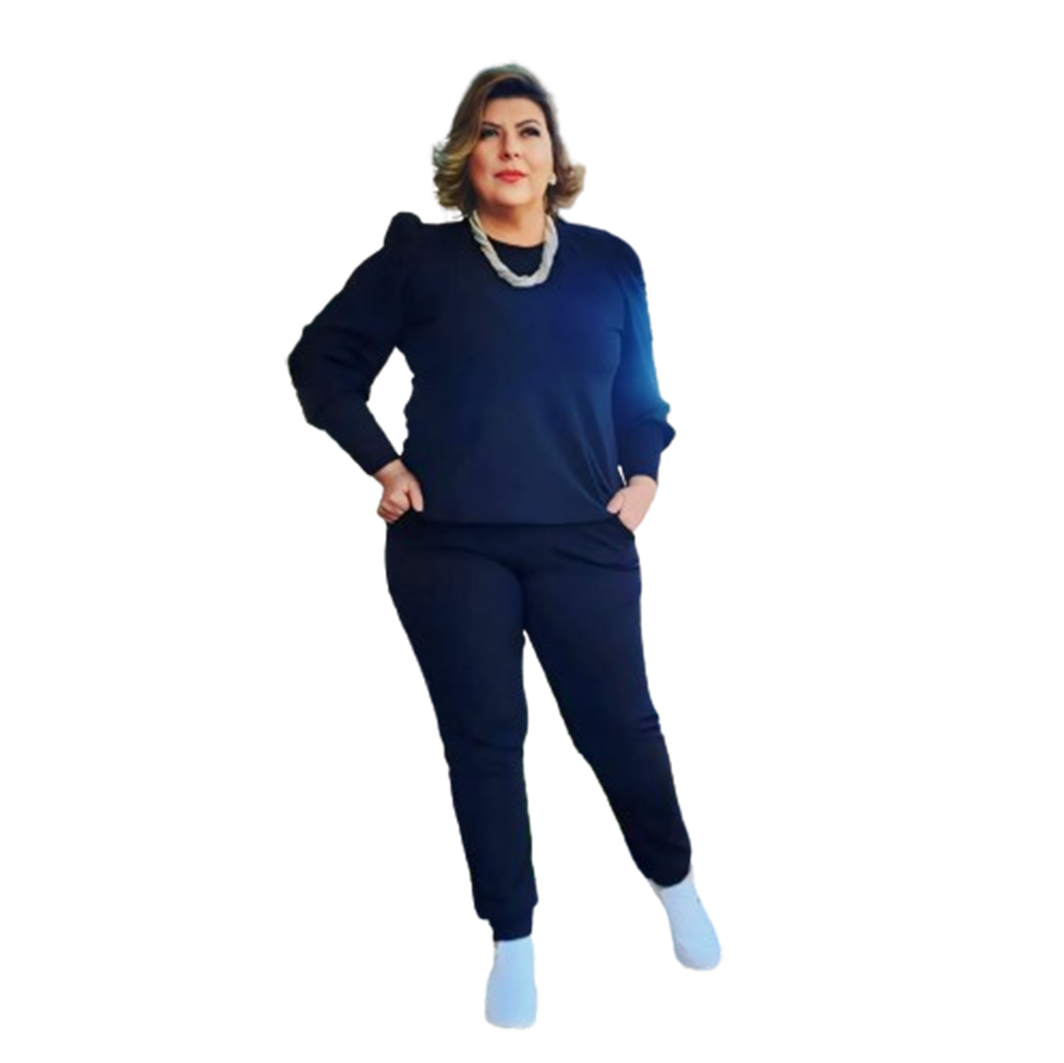 Sugestão de uso: O conjunto em crepe de malha é uma ótima escolha para looks confortáveis e estilosos.