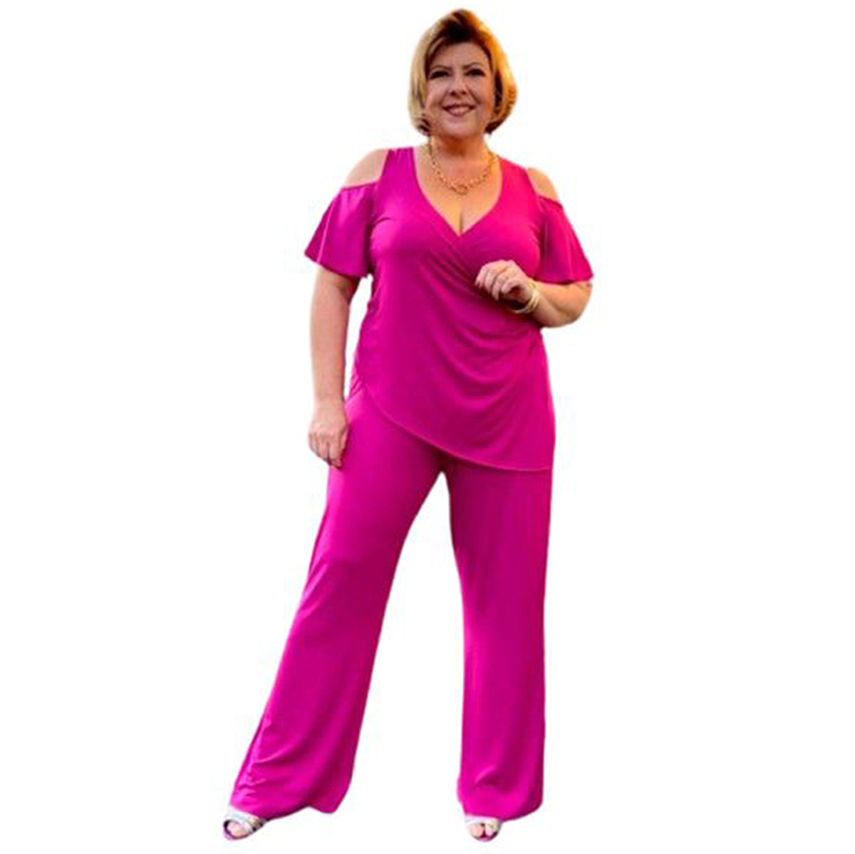 Diferencial de modelagem: O macacão transpassado alem de dar um toque a mais no visual, tem uma vantagem em evidenciar a cintura sem marcar nada, disfarçando a barriga.